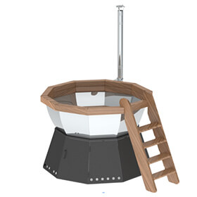 Борта изготовлены из прочной и целебной древесины кедра, чан оборудован удобными деревянными сидениями, лестница оснащена функцией противоскольжения, а для защиты ног установлен подножник (деревянная решетка).