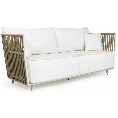 Каркас мебели выполнен из алюминия, окрашенного в белый цвет. Покрытие изготавливается вручную с использованием высококачественной тканой ленты SunProof® (100% олефин), специально разработанной для использования на открытом воздухе. Такой материал характеризуется превосходными прочностью и долговечностью, по сравнению с традиционными природными волокнами и, кроме того, практически не требует обслуживания и легко чистится.
