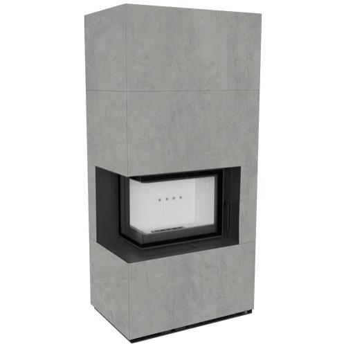 Каминокомплект Kratki Pro Floki в облицовке Cemento Grigio Bocciardata, угловое стекло слева (светлая футеровка)