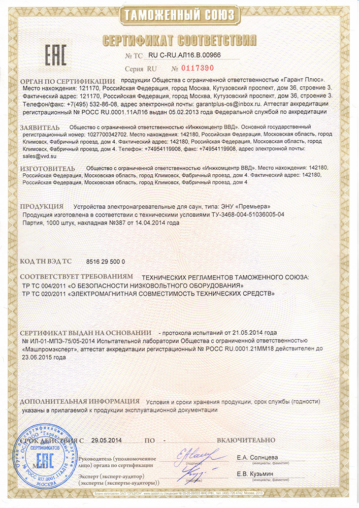 Инструкции, чертежи, документы - Электрическая печь для бани Инжкомцентр ВВД Премьера Руса 10 кВт