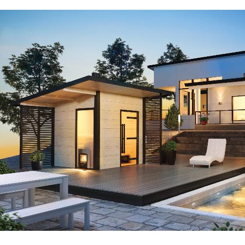 Снаружи сауну можно покрасить в цвет, который гармонично сочетается с оттенком дома или остановить свой выбор на естественном светлом оттенке дерева с декоративными темными вставками.