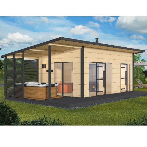 Данная модель представляет собой легкую в монтаже конструкцию без фундамента и состоит из парной, помещения для переодевания, отдельной комнаты и открытой террасы.