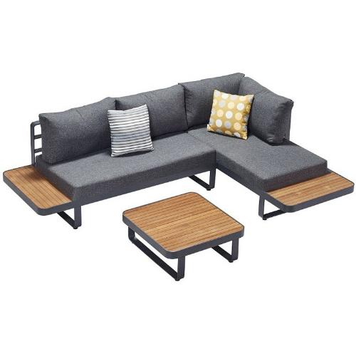 Набор Carribean имеет полностью алюминиевую раму с темно-серым порошковым покрытием и тонкой отделкой с закругленными углами и утопленными планками из тикового дерева.