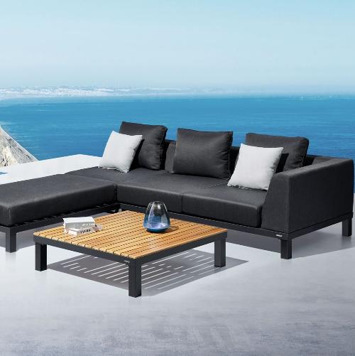 Кроме того толстые подушки делают эту коллекцию одной из самых удобных и приятных благодаря использованию быстросохнущей пены, покрытой текстильным материалом, который уравновешивает принципы долговечности и мягкости. Не говоря уже о элементах из натурального дерева, которые при необходимости можно использовать в качестве удобных боковых столиков.