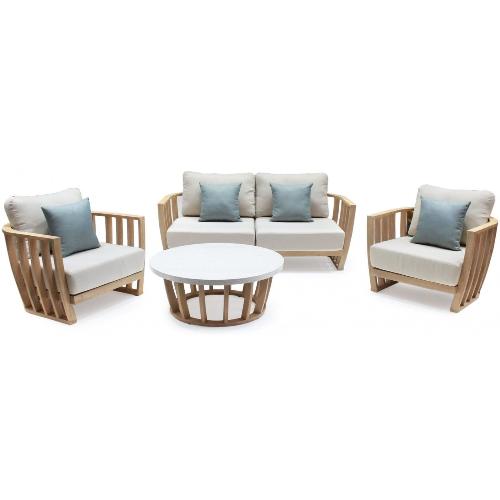 Изготовленный из высококачественного ЭВКАЛИПТА, набор Woodland прочен и долговечен, а толстые подушки из олефина сохранят свою форму и не испортятся со временем. Древесина, одобренная FSC, обладает естественной водонепроницаемостью, поэтому вы можете хранить комплект для отдыха на открытом воздухе круглый год. Цвет натуральной твердой древесины представляет собой натуральный цвет с мелкой текстурой, придающий древесине приятный теплый вид. Соответствующий журнальный столик имеет толстую столешницу из Terrazzo, износостойкую и легко чистящуюся. Woodland поставляется с 4 элегантными декоративными подушками цвета морской волны, которые дополнят ваш потрясающий комплект для отдыха.