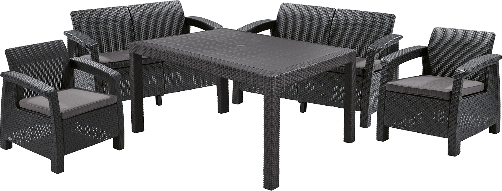 Corfu Fiesta - это мебельный гарнитур с фактурой поверхности, напоминающей ротанг, в состав которого входят: два кресла, две двухместные софы и большой прямоугольный стол. Подушки сидений входят в комплектацию. Набор идеально выполняет функции мебели для приема пищи. Он идеален в качестве дизайнерского решения для больших пространств, превосходно подходит для организации семейного гриля или вечеринки в саду. Мебель обладает прочностью и стойкостью к воздействию неблагоприятных погодных условий и УФ-лучей. Corfu Fiesta предлагается в элегантной цветовой гамме. Легко чистится, просто собирается.