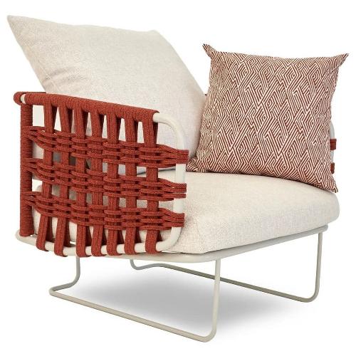 Коллекция Nido с ее насыщенными тонами встречает гостей беспрецедентной универсальностью: она идеально подходит как для светских мероприятий, так и для приватного отдыха. Баланс форм и объемов адаптируется ко всем различным пространствам, от домашних террас до элегантных и изысканных открытых площадок отелей и крупных заведений. Уникальная переплетающаяся веревочная система, являющаяся легким мотивом всей коллекции, обеспечивает крепкую плетеную спинку диванов и кресел.Мягкие подушки, чередующиеся однотонными цветами с геометрическими узорами, создают удобные поверхности для сидения. Металлические конструкции переплетаются с тканевыми веревками, создавая расслабляющее гнездышко на открытом воздухе. Оригинальные и элегантные кресла Nido идеально подходят для того, чтобы приятно провести время на свежем воздухе.