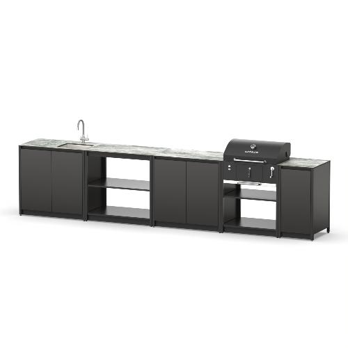 Уличный барбекю комплекс из пяти модулей закрытого типа с угольным грилем, столешницей и мойкой.
