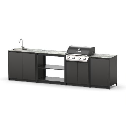 Мангальный комплекс из четырех модулей смешанного типа с мойкой, столешницей и газовым грилем.Размер мойки: