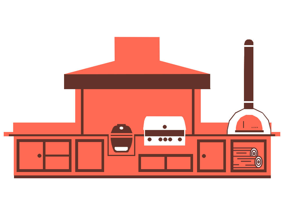 Корпус и фасады кухни выполнены из оцинкованной стали. Столешница - гранит. В комплект входит: модуль под мойку, модуль для хранения с тремя ящиками, печь под казан, модуль под керамический гриль, модуль для газового гриля Bull Angus, модуль для хранения газового баллона, печь для пиццы, вытяжной зонт, столешница из натурального гранита, фартук из натурального гранита.