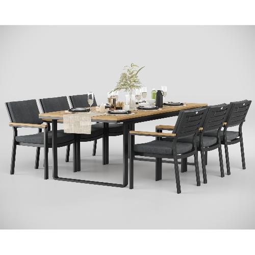 Особенности: каркас мебели выполнен из всесезонного алюминия с порошковым покрытием темно - серого цвета (карбон), подлокотники стульев декорированы вставками из тика, подушки сидений и спинки обшиты уличной тканью (олефин) темно - серого цвета, толщина подушек 5 см, чехол съемный на "молнии", столешница обеденного стола изготовлена из тиковых планок