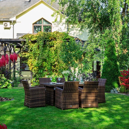 Благодаря качественным и долговечным материалам обеденный комплект FIONA станет надежным спутником Вашей загородной жизни на долгие годы! В комплект входят: - 6 комфортабельных кресел с подлокотниками, высокими спинками и мягкими подушками; - большой обеденный стол со столешницей из закаленного стекла. Съемные чехлы для подушек серого цвета изготовлены из водоотталкивающей ткани, которая не подвержена изменению от погодных условий. Сдержанный современный дизайн и использование нейтральных коричневых оттенков - преимущества комплекта. Этот набор садовой мебели будет гармонично смотреться в любом окружении. Он подходит для установки на террасе или веранде, в летней беседке или под открытым небом на Вашем участке.