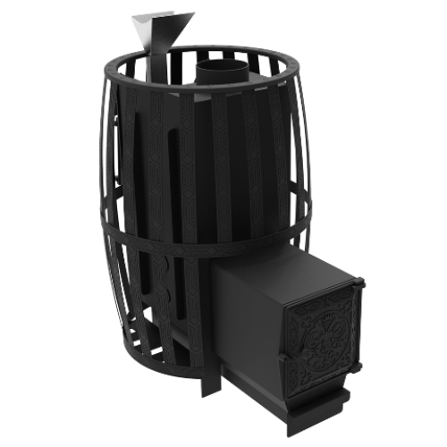 Банная печь накопительного типа, объединившая в себе две каменки - открытую и закрытую. Открытая каменка, как у большинства классических печей, прогревается от газоходных каналов и нагревает камень до температуры 250-300С.