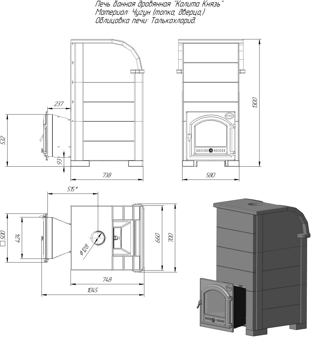 Банная печь Инжкомцентр ВВД Князь Калита в облицовке талькохлорит (дверца стальная окрашенная)