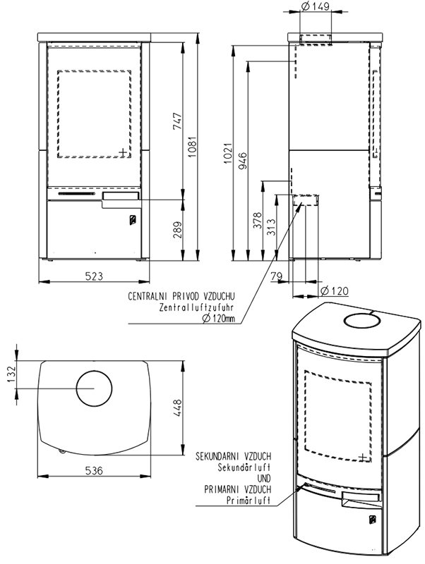 высота: 1081 мм, ширина: 536 мм, глубина: 448 мм.