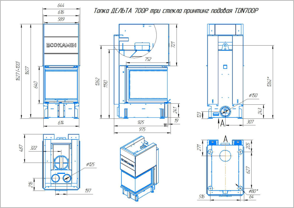 Инструкции, чертежи, документы - Каминная топка ЭкоКамин Дельта 700 PB три стекла подовое горение принтинг черный шамот