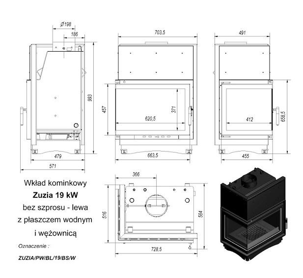 Инструкции, чертежи, документы - Каминная топка Kratki Zuzia/PW/BL/19/BS/W (угловое стекло слева, змеевик)