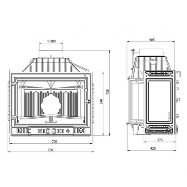 Еще одной отличительной особенностью каминных топок Kawmet является наличие встроенной шиберной заслонки с блокиратором дверцы.