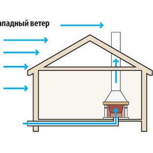 Вначале определите сторону ветра, который преобладает в данной местности. Оттуда и забирают воздух. Если входное отверстие расположено с подветренной стороны, в дни сильного ветра в канале возникнет разрежение и воздух уйдет из камина, а не поступит в него. Если нет возможности расположить по ветру, лучше делать, как сможете, чем не делать совсем. В таком случае попытайтесь забор воздуха вывести в место, где воздух циркулирует свободно.