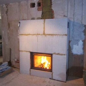 2. Изготовление нижней части облицовки и установка топки. Благодаря отменной прочности отсутствует риск деформации, а теплоизоляция устраняет риск не только возгорания, но и изменения внешнего вида облицовки.