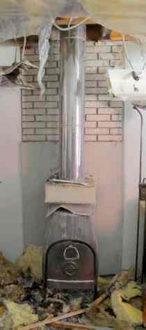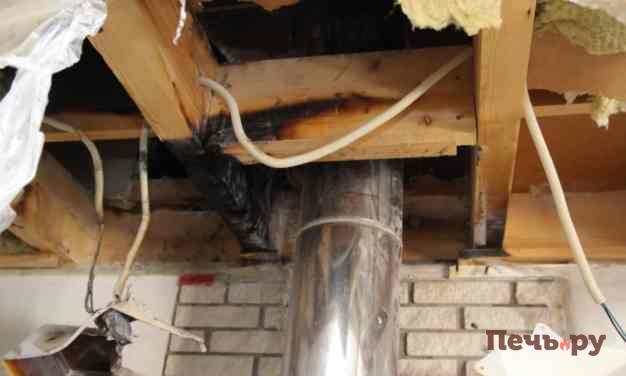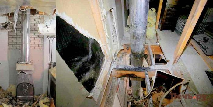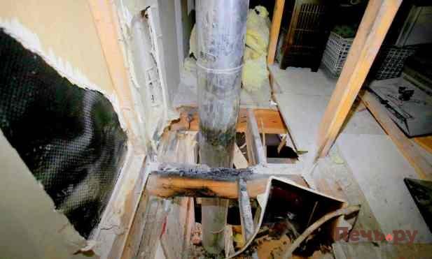 Вдвойне опасно, когда противопожарная разделка при проходе перекрытий выполнена с ошибками. На фото представлен такой пример.