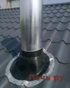 Для кровель из черепицы или шифера выпускают уплотнители с алюминиевым или свинцовым фланцем. Их конус также срезается, для плотного прилегания манжеты к трубе. Верх металлической основы заводят под кровлю, нижняя и боковая часть укладывается на кровлю. Чтобы влага не попала под нее, необходимо загнуть верхнюю кромку. В конце нужно залить силиконом проблемные стыки.