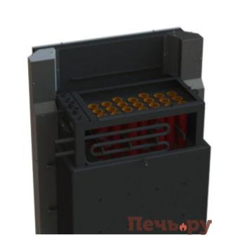 Каминные топки с водяным контуром считаются лучшими источниками тепла для домов. Весь процесс съема тепла происходит в теплообменнике. Он находится над топочной камерой. В этом месте жидкость нагревается до 80 градусов, откуда поступает в резервуар-накопитель через систему труб. Здесь сохраняется жидкость, которая в дальнейшем используется при необходимости для разных нужд.