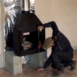 Сначала необходимо решить вопрос с местом установки камина. Камины бывают пристенные или угловые, соответственно, устанавливаются у стены или в углу. Если камин монтируется у стены из горючих материалов, то необходимо установить противопожарную стенку. Она выполняется из так называемого пирога, состоящего из негорючих материалов и воздушного зазора. «Пирог» выглядит как настоящая стена с тем лишь отличием, что является полностью негорючим. К этой стене мы устанавливаем топку и облицовку.