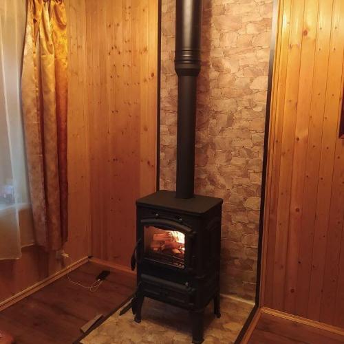 Печь привезли и поставили на приготовленный подиум. Подиум и стена выполнены из камня. Дымоход пойдет через потолок. Ставим его на печь и проделываем отверстие 60 на 60 см. в потолке.