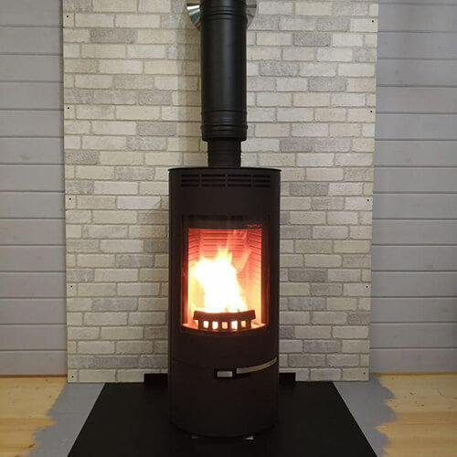 Крепим на профиля фиброцементные плиты с узором светлого кирпича. Ставим печь и выводим дымоход в стену. Отверстие закрываем фланцем.